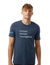 Features Blue Shield logo on the right sleeve and 'Human. Honest. Courageous.' text on the front.